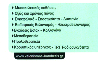 Ιατρικός Βελονισμός, Μεσοθεραπεία, Κρουστικός Έλεγχος,Στοχευμένες θεραπείες με ραδιοσυχνότητεςΔέχεται με ραντεβού